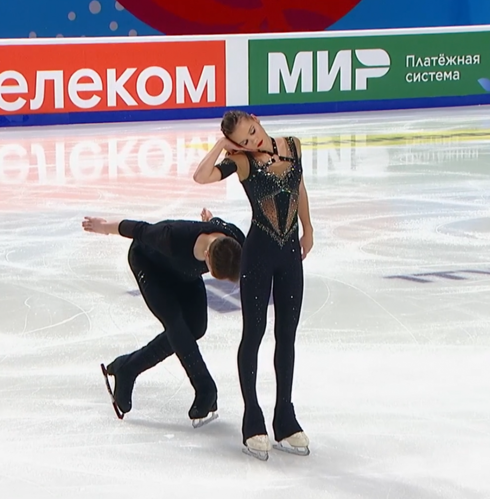 Gli ex-compagni di allenamento Boykova/Kozlovskiy avrebbero dovuto essere perfetti per sperare di poterli sconfiggere, ma in entrambi i segmenti di gara i campioni europei di Graz 2020 sono incorsi in un’imprecisione che è costata loro moltissimo in termini di punti: entrambe le volte è stata Aleksandra a commettere errori sull’arrivo del salto in parallelo, il triplo loop atterrato sul quarto, nel corto, segmento di gara pattinato sulla “Boheme” di Charles Aznavour, e il triplo toeloop atterrato con step-out e appoggio delle mani sul ghiaccio nel libero, pattinato diversamente sull’arrangianento di Max Richter delle “Quattro Stagioni” di Vivaldi.