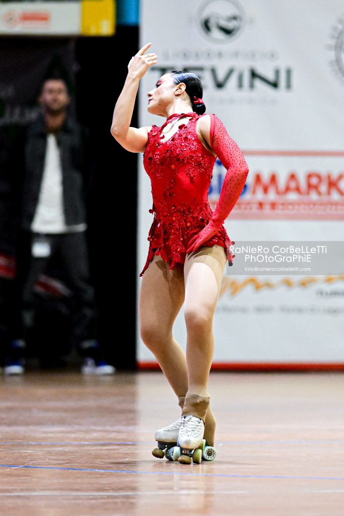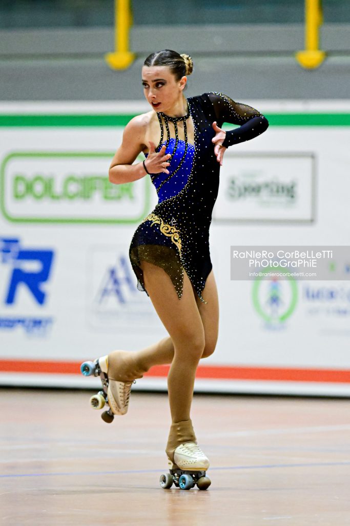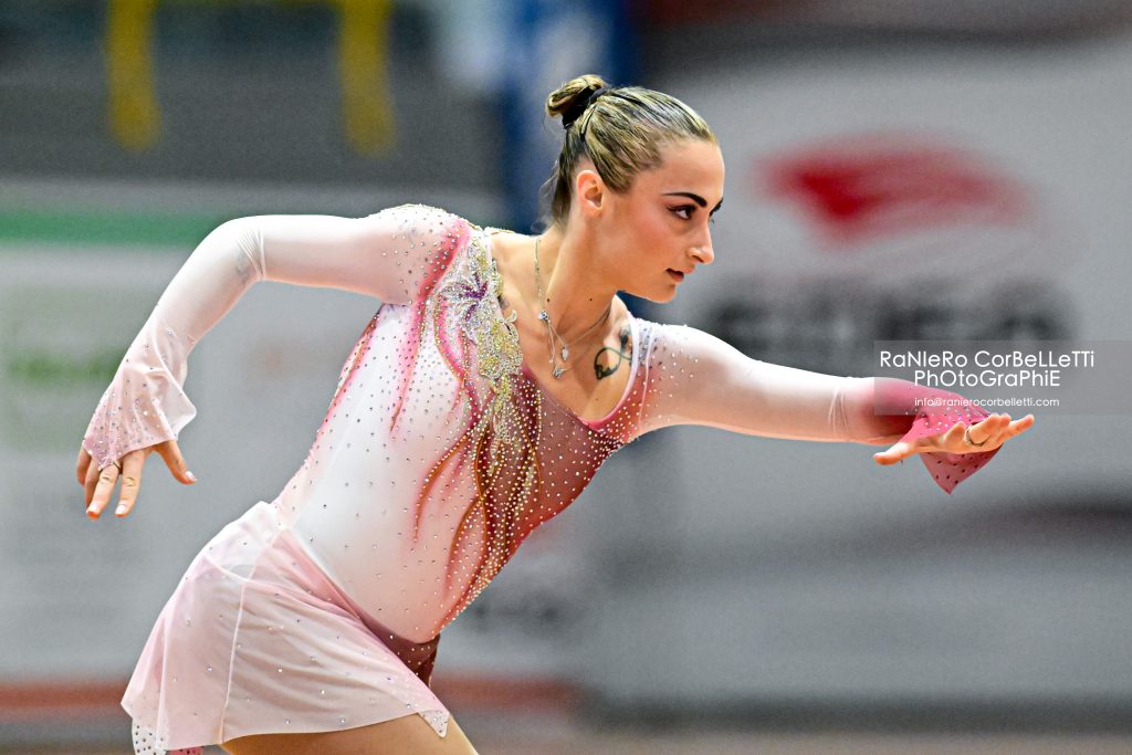 Premesso che la vincitrice della categoria junior, Matilde Caputo, ha fornito una prestazione decisamente migliore di quelle mostrate dalle atlete seniores, il titolo è andato con pieno merito a Benedetta Altezza, atleta che dopo un’attività ai vertici nazionali juniores, è letteralmente esplosa quest’anno ai massimi livelli nazionali. La pattinatrice campana, seconda ai Nazionali juniores nelle ultime due stagioni, nonché bronzo ai Mondiali junior 2022, ha preso il comando delle operazioni già nel programma corto, proposto su splendidi brani della cantante “marrana” (così si definiscono gli ebrei spagnoli, ndr) Yasmin Levy: dopo una sequenza iniziale triplo toeloop-doppio toeloop-euler-triplo salchow, Benedetta ha realizzato anche un triplo salchow in singolo e un doppio axel, il tutto con il corollario di una sequenza di passi di livello due.