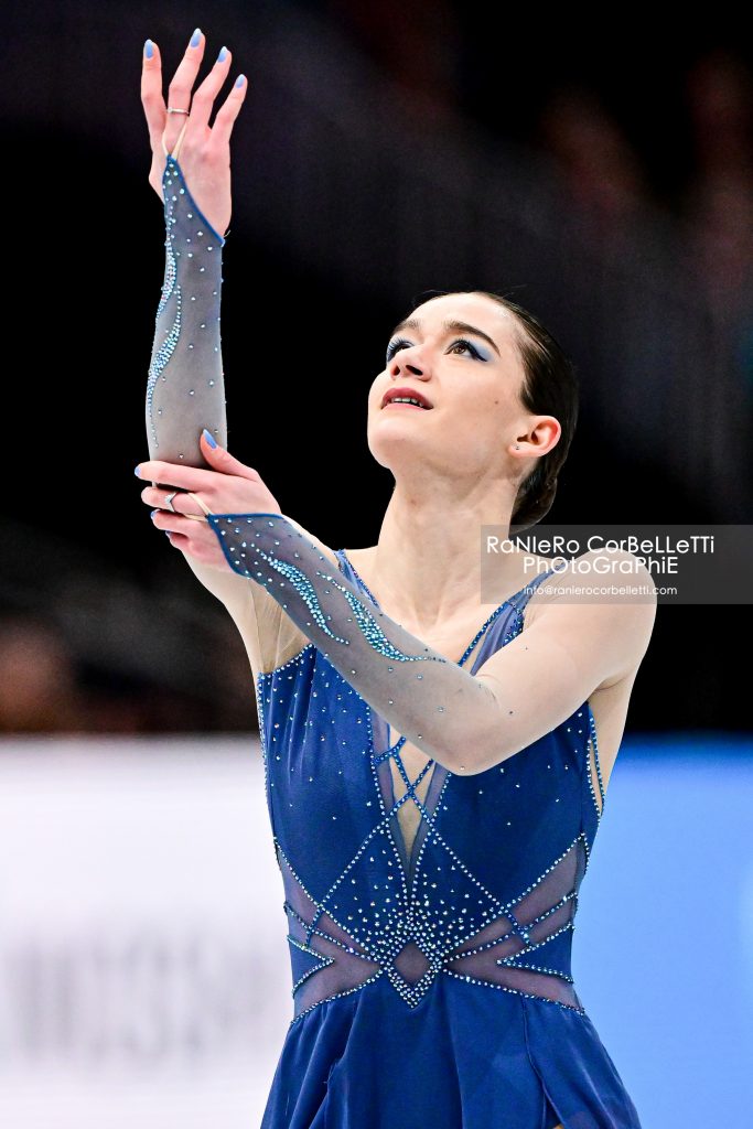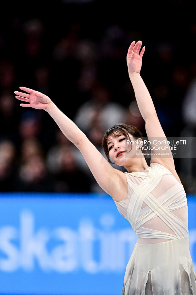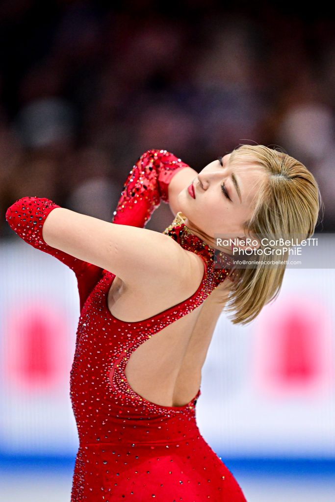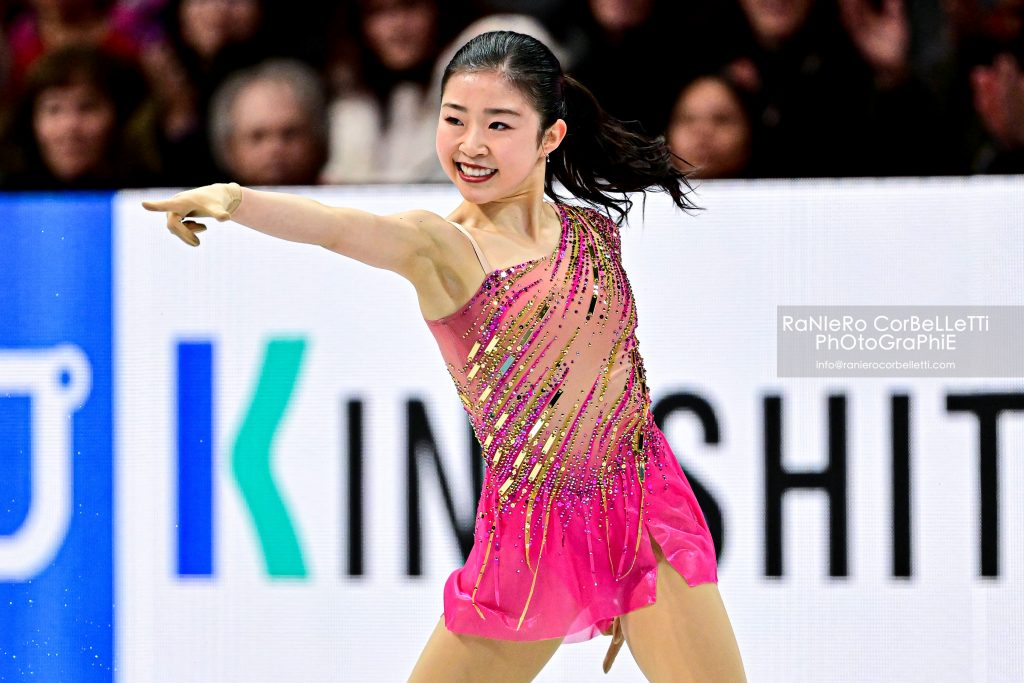 L’allieva di Sonoko Nakano eseguiva solo doppio il previsto triplo flip della sua combinazione con il triplo toeloop, finendo per perdere oltre tre punti rispetto alla vincitrice. Nel libero, sulle note della colonna sonora di “Chicago”, pur con due imprecisioni significative, ovvero il triplo salchow sottoruotato, posto alla fine della combinazione con il doppio axel e l’euler, e il triplo toeloop della combinazione con il triplo flip atterrato sul quarto, riusciva in una bella rimonta, che la portava alla medaglia d’argento, strappata per pochi punti alla connazionale Mone Chiba. La diciannovenne di Kyoto, allieva di Mie Hamada, campionessa dei Four Continents nel 2024, aveva guadagnato la seconda posizione nello short, allorchè, anche lei sulle note di Donna Summer, nell’occasione quelle di “Last Dance”, era riuscita nella combinazione triplo lutz-triplo toeloop, quest’ultimo completato sul quarto di rotazione, nel doppio axel e nel triplo flip. Nel libero, sulle note delle musiche del compositore francese Ives Leveque, come la Sakamoto anche lei commetteva alcuni errori, sottoruotando il triplo salchow e il secondo triplo lutz in combinazione con doppio toeloop e doppio loop, ma conservando però con margine di sicurezza la medaglia di bronzo.