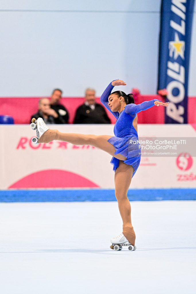 A rendere esplicita la sua intenzione di appropriarsi di tale prestigioso alloro, è stata la vicecampionessa del mondo Gioia Fiori, nettamente prima nonostante alcune imprecisioni assolutamente legittime in tale fase della stagione. La pattinatrice di Anguillara, vera e propria “eroina dei due mondi”, visti i suoi impegni agonistici anche nel pattinaggio su ghiaccio (quest’anno è stata terza ai Campionati Italiani Juniores, ndr), ha da subito dato spettacolo, imponendosi con grande autorità, dall’alto di una qualità tecnica e artistica che al momento, nella categoria, non trova eguali.