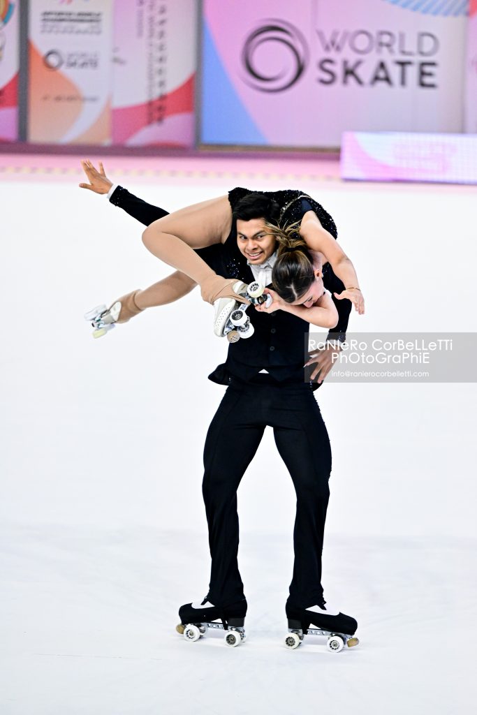 In generale la competizione ha proposto un dato davvero incoraggiante, quello di avere in gara ben diciannove binomi, pur senza le coppie di Taiwan e dell’India, inizialmente iscritte ma poi non confermate. In coda alla classifica, forse immeritatamente, sono finiti i fratelli cinesi Jiying Yan e Caide Yan, in realtà italiani a tutti gli effetti, essendo nati e cresciuti in quel di Brescia: Milly e Mirko, come sono meglio conosciuti, sono dotati di linee molto eleganti e non mancano di buona tecnica individuale, così che, se solo avranno la pazienza di continuare a lavorare in coppia sotto la guida del loro tecnico Marco Pescatori, non mancheranno di ottenere belle soddisfazioni. Da segnalare anche due bellissime storie, quella degli americani Aleeya Hart/Chance Becker e degli australiani Harper Connors/Oscar White, presenti ai Mondiali solo grazie a una raccolta fondi messa in atto su internet. Inoltre, in veste di allenatrice accanto ad Aleeya e Chance è stato commovente vedere una vera e propria leggenda del rotellismo statunitense, Caroline Mirelli, ancora in pista a spronare i suoi atleti a 95 anni suonati!