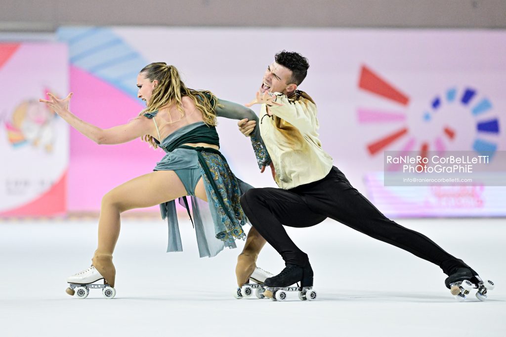 La gara della danza è stata davvero di grande livello, avendo proposto in lizza coppie dotate di un grande talento, fatto pienamente risaltare da regolamenti, quelli della danza a rotelle, capaci di tutelare pienamente la grande tradizione della specialità. Ad imporsi per la terza volta consecutiva sono stati gli azzurri Roberta Sasso e Gherardo Altieri De Grassi, che nell’occasione sono divenuti la quinta coppia nella storia delle rotelle a centrare questo traguardo, dopo che in passato vi riuscirono due leggendarie coppie statunitensi, Fleurette Arsenault/Dan Littel (nel ’77, ’78 e ’79) e Jodee Viola/Greg Goody (nell’89, ’90 e ’91), oltre che due straordinari binomi italiani, quello di Melissa Comin de Candido/Mirko Pontello (nel 2008, 2009 e 2010) e quello di Anna Remondini/Daniel Morandin (nel 2017, 2018 e 2019).