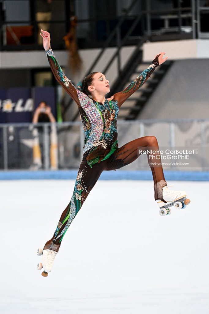 La portoghese, originaria della località di Santa Cruz sull’isola di Madeira, gioiello dell’omonimo arcipelago nell’oceano Atlantico, è allieva di Sheila Rodrigues e spesso è seguita anche dall’ottimo tecnico italiano Massimo Giraldi, un ex-pattinatore capace di medaglie in sede europea e mondiale. A livello tecnico, va detto che padroneggia con sicurezza sia il triplo lutz che il triplo flip ed è in grado di realizzare trottole in posizione Biellmann di straordinaria fattura. A Trieste oltre al triplo lutz, ha eseguito ben tre combinazioni con salti tripli, flip-euler-salchow, salchow-toeloop e flip-toeloop, cadendo inopinatamente nel doppio axel. A livello artistico mostra per logica ancora una certa immaturità, complice anche una coreografia, come quella del suo libero di quest’anno, al quanto discutibile, nel momento in cui risultando pressoché interamente caratterizzata da una serie di parti “parlate”, impedisce all’atleta di assecondare il ritmo e le nuances comunque presenti della musica. Resta il fatto che siamo di fronte a una campionessa dalla classe cristallina, destinata a diventare un simbolo del pattinaggio a rotelle internazionale.