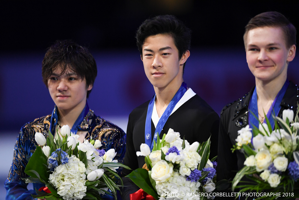 Nella foto Shoma Uno JPN, Nathan Chen USA e Mikhail Kolyada RUS, sul podio ai Mondiali di Milano 2018